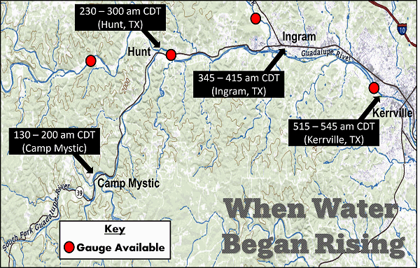 In the image: Forecasters had no way of knowing (without reports) about a wall of water along the South Fork Guadalupe River southwest of Hunt, TX early on July 4, 2025, even though a Flash Flood Warning was in effect (issued at 114 am CDT). There were no gauges in the area. At Camp Mystic, twenty-seven people (mostly children) were killed. After detection by gauges downstream, the wall had a history of thirty foot rises within two hours after arrival.